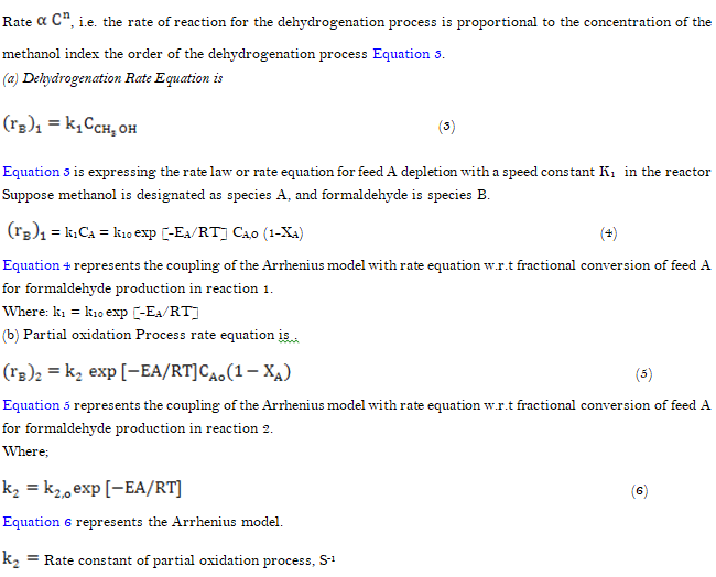 The kinetics according to Equations 1 and 2 above are two main process for formaldehyde production; dehydrogenation and partial oxidation reactions according to Jilesh and Linesh [7] kinetic literature data adapted for the research.