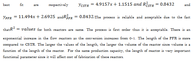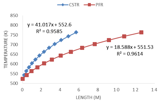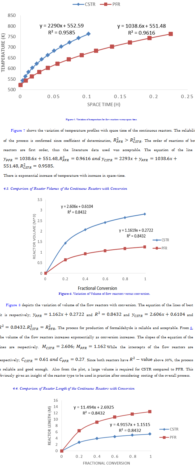 Figure 6 depicts the variation of temperature profiles of flow reactors with length. There is exponential increase of the temperature profiles of the flow reactors for CSTR and PFR with increase in the length of the flow reactors. The reliability of the process is such that temperature value of the PFR is fairly close to the CSTR. Both flow reactors are of order 1 meaning that the data and results are reliably acceptable and good for the production of formaldehyde.