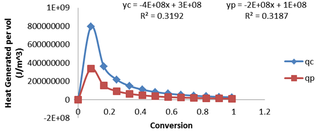 Figure 12 depicts the relationship between the heats generated per unit volume varying with conversion. Both reactions progressed from initial condition to a maximum point and starts decline to a steady state process, as the heat generated per unit volume reduces with increase in fractional conversion.