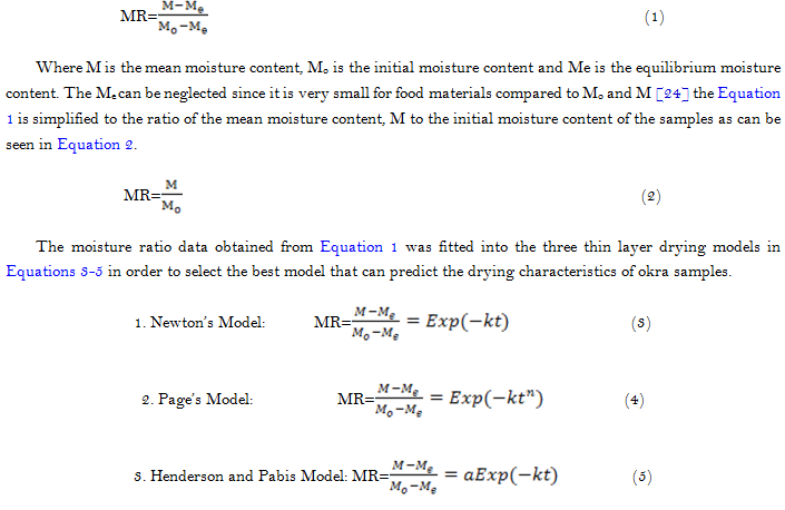 Also, Equation 1 is the experimental moisture ratio, (MRexp) while Equations 3-5 are the predicted moisture ratios (MRpre) from the models