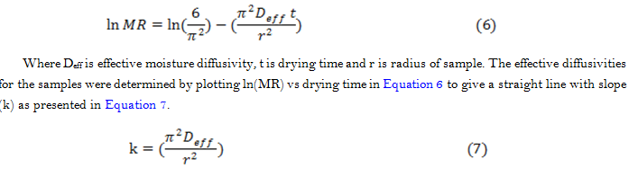 Effective Moisture diffusivity was obtained for Okra using Fick’s second Law for Diffusion which was simplified to a straight line equation as presented in Equation 6