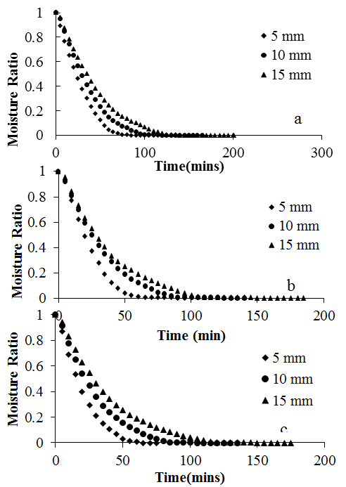 The relationship between the effective moisture diffusivity and sample thickness was investigated by plotting the effective moisture diffusivity values obtained from Equation 7 against the sample thickness and the results presented in Figure 4. The effective moisture diffusivity was found to be temperature dependent as well as thickness. The values obtained for all temperatures for 5mm thickness was higher compared to what was obtained for 10mm and 15mm. This is due to the fact that sample of smaller thicknesses had larger surface areas; hence the diffusion of water molecules in them took place faster compared to samples of bigger thicknesses. Higher effective moisture diffusivity of materials with smaller thickness have also been observed by other researchers [10].