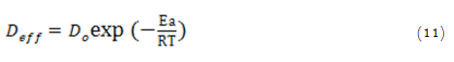The temperature dependency of the effective moisture diffusivity of okra was investigated from Equation 11. Activation energy is the minimum amount of kinetic energy required for a reaction to take place. An increase in temperature brings about a corresponding increase in activation energy. The Deff values obtained from Equation 7 for all samples were inserted into Equation 11.