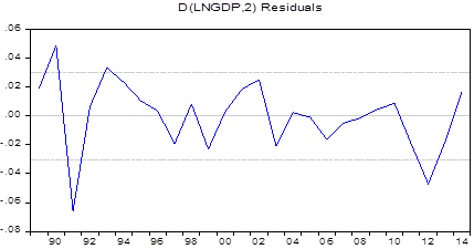 The VECM result presented above using least square estimation method was conducted at 5% level of significance. The result showed that the log of capital and log of labour significantly determined the Nigerian economic growth in the second lad. Therefore, capital and labour had statistically significant impact on the economic growth of Nigeria after two years. Their effect on the gross domestic product of Nigeria was insignificant after one year, however, in the third year, just as in the second year, capital had negative impact on economic growth as in the Cobb-Douglas model, while employed labour contributed positively to the growth of the Nigerian economy for the period of study. Technology impact on growth was insignificant in the two lags. Nonetheless, in the first lag it had positive impact, though not significant but in after the second year, the effect became negative on economic growth. Therefore, it implies that technology input in Nigeria is only productive in the first and second year, after which it becomes counterproductive or starts experiencing diminishing return in production. The joint effect of the lagged independent variables [D(LNGDP(-1),2) D(LNGDP(-2),2), D(LNK(-1)), D(LNK(-2)), D(LNL(-1)), D(LNL(-2)), D(LNA(-1)), D(LNA(-2))] on the GDP is 1.848327, suggesting insignificance.