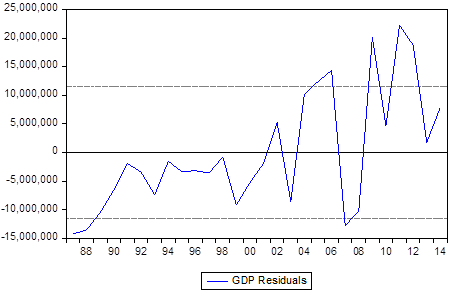 Although the error correction coefficient had a speed of adjustment of -225.64%, its adjustment to long run equilibrium was insignificant (0.0782 > 0.0500). The sign of the ECM followed the a priori expectation. The independent variables jointly determined 58.43% of the variations in the gross domestic product of Nigeria and therefore, can be said to be fairly fitted. The residual of the model had a constant variance, which is desired but it also showed evidence of autocorrelation.