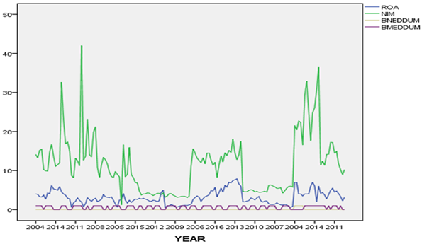 Figures 1 and 2 below indicate that the variables fluctuated within the period of the study. The fluctuations reflect changes in board appointment, economic situations and market structures particularly with respect to net interest margins (green color- Figure 1). The trend of the net interest margin (NIM) shown above particularly as exhibited by Figure 2 reflects some extreme NIM values recorded by some of the selected banks for this study. For instance, within the period, First Bank Nigeria recorded the highest NIM of 86.32% in 2014 suggestively following risk assets restructuring which might has resulted in lower loan value. Also, Standard Chartered Bank of Ghana documented a NIM of 36.45% in 2016- the highest in the year among the banks. The extreme values combined to generate the maximum average value of 42%- considered too high.