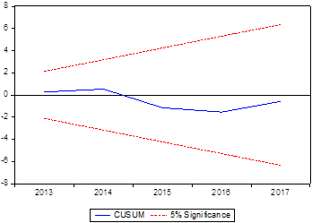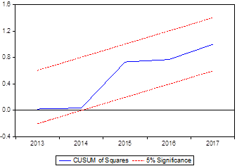 All over again, the CUSUM test is often used by the researchers to examine the stability and structural breaks of the estimated Autoregressive Distributed Lag (ARDL) model. CUSUM and CUSUM squares charts of our estimated model are presented below in Figure 16 and Figure 17. This test is based on a simple rule of thumb which postulating that the blue line should be within the limits of red dotted lines where dotted lines are displaying the upper and lower bounds critical value of the estimated model. Because our estimated model is meeting the stability criteria of the CUSUM test so we can conclude that our estimated ARDL model is stable.