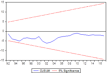 We applied Bounds test again to examine that whether there are long-term relationship exists between the understudy variables or not. The null hypothesis of the bound test states that there is no long-run relationship exists among understudy variables. Following table is showing the results of Bounds test where F-Statistics is greater than the upper and lower Bound critical values which means reject the null hypothesis. In other words, the long run relationship exists among variables (see Table 17).