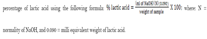A standard protocol was followed to evaluate the kinetics of acidification continuously for 7 days and after the 15th day of fermentation, it is consisting of pH measurements using a potentiometer UB10 UltraBasic (Denver Instrument, USA) and lactic acid percentage determination with the procedure reported [7] briefly, the silage samples in triplicate were diluted in distilled water (1:10) and the lactic acid concentration was determined by titration with 0.1N NaOH until a final pH of 7.5. The milliliters of used NaOH were recorded to calculate the