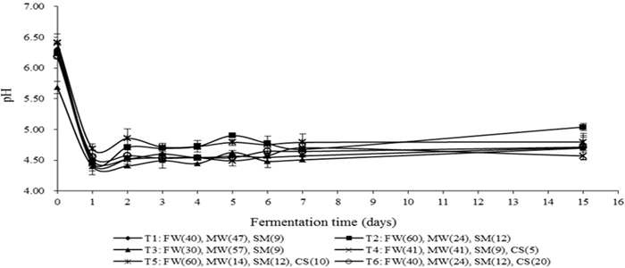 The six treatments based on mango and fish wastes showed adequate acidification during fermentation from one day to the fifteenth day, with pH values between 4.39 and 4.70 (Fig. 1), and lactic acid values from 2.96 to 4.42 % (p≤0.05), (Table 3).