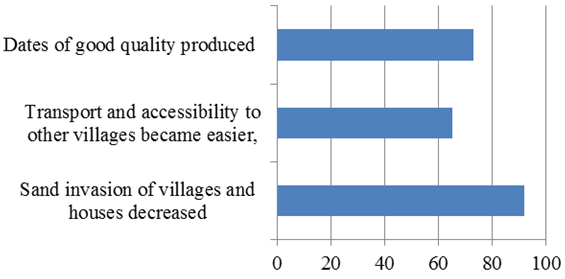 According to the surveyed local population, the situation of the village was enhanced after combating silting intervention: the land and the roads are almost dredged. In fact, 92% of interviewed population declares that sand invasion of villages decreased thanks to the protection provided by huge works of mechanical dredging, establishment of dunes, Tabias structures and reforestation works. The quality of life of the inhabitants is better than that observed before amenities. As well, 65% of interviewed population affirms that transport and accessibility to other villages became easier, it facilitated the access of the inhabitants to the adjacent villages, and growing conditions are improved Figure 6. Also, 73% of the surveyed population states that intervention against silting managed to improve the inhabitants’ welfare and to protect oases boundaries from silting resulting in producing dates of good quality better than those of neighboring regions unsupplied with any amenities.