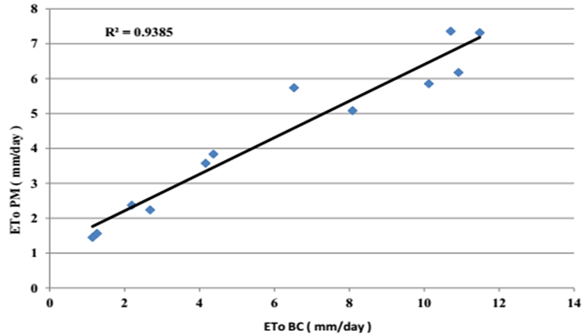 The BC ETo equation overestimates PM FAO-56 ETo equation by 28.637% at Faisalabad weather station when compared with FAO-56 PM ETo equation as shown in Figure 4 and Table 3.