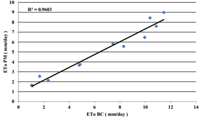 When the Blaney-Criddle ETo equation is compared with the standard FA0-56 PM ETo equation, it overestimated FAO-56 PM ETo equation by 34.34% at Lahore weather station as shown in Table 2 and Figure 2.