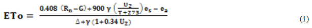 ETo = reference evapotranspiration (mm day-1); Rn = net radiation at the crop surface (MJm-2 /day); G =soil heat flux density (MJ m2/day); T = mean daily air temperature at 2 m height (°C); U2 = wind speed at 2 m height (m/s); es =saturation vapour pressure (kPa); ea = actual vapour pressure (kPa); es-ea = saturation vapour pressure deficit (kPa); ∆ = slope vapour pressure curve (kPa/ °C); γ is the psychometric constant (kPa (°C)−1) The computation of all data required for the calculation of the ETo followed the method of Hargreaves and Allen [9].