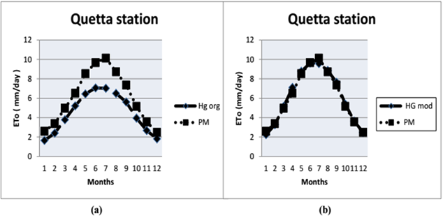 Figure-1. Comparison of ETo by PM with (a) HG org and (b) HG mod methods at Quetta weather station.