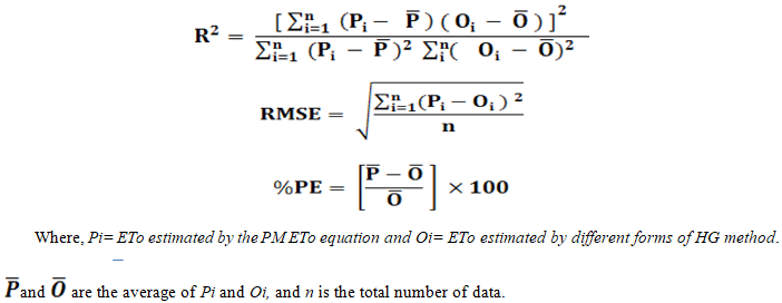 In this study, the roots mean square error (RMSE), percentage error of estimate (PE), standard error of estimation (SEE) and coefficient of determination (R2) are used for the evaluation of ETo methods.