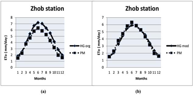 Figure-2. Comparison of ETo by PM with (a) HG org and (b) HG mod methods at Zhob weather station.