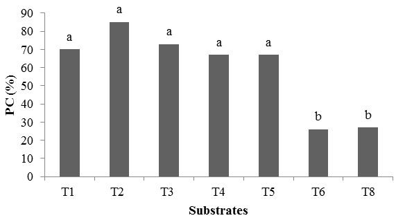 This result can be justified by Barbosa [21] who states that the substrate can indirectly influence the emergency capacity, since its physical and chemical properties such as high porosity and the presence of electrical charges provide greater water absorption, at the same time. That maintains a good aeration. As a result, there is enough water in the seeds to help break down tegumentary dormancy, in addition to activating the enzymes responsible for the germination process.