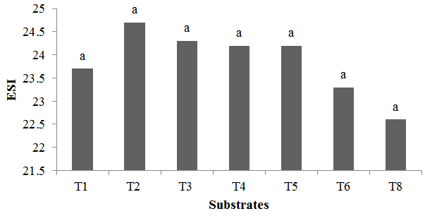 In Figure 4, it is possible to observe the effect of substrates on the emergence speed index of seeds of this species, with no significant differences being observed, that is, the tested substrate combinations are statistically equal to the 5% probability level. , with averages between 24.7 and 22.6 between treatments T2 and T8, probably because they provide good drainage and porosity, allowing the entry of air and water with adequate amounts for the establishment of seedlings.