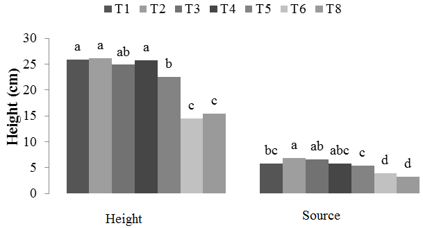 Regarding the height of seedlings, it is observed in Figure 5 that the best performances were obtained with the treatments T1 (sand), T2 (sand + coconut fiber) and T4 (sand + bovine manure) with averages 25.9; 26.2; 25.8 cm respectively, statistically correlating with treatment T3 (sand + rice husk), which showed an average of 24.9 cm, but differing from treatments T5 (sand + pine powder), T6 (sand + chicken manure) and T8 (sand + quail bed) in which they presented lower performances with averages of 22.5; 14.5 and 15.4 cm. In an emergency study with Campomanesia pubescens, Periotto and Gualtieri [22] using the substrate sand + coconut powder obtained shorter lengths in height. Guimarães, et al. [23] evaluating substrates containing different organic residues and mineral fertilizers for the production of castor beans, concluded that the substrate composed of bovine manure provided the best growth of castor. Results obtained by Farfan, et al. [24] prove that the use of compost based on mango leaves and bovine manure enriched with agricultural plaster promoted greater height of moringa seedlings. Mexal and Lands [25] report that the plant height presents a good estimate of the initial seedling growth in the field, being accepted as a good measure of the plant's performance potential.