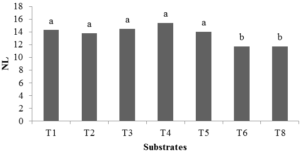 Figure-6. Average values for the number of leaves depending on the substrates. Same letters do not differ by Tukey's test (P <0.05).