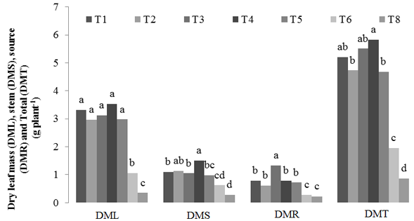 For DMS the maximum production was found in treatment T3 presenting 1.50 g plant-1, corroborating with treatment T2 (sand + coconut fiber), which proved to be a good substrate for the germination of this species. Then treatments T1, T4 and T5 with averages between 1.09 and 0.98 g plant-1, lower results found for treatments T6 and T8 where the stem biomass was equivalent to 0.2 g plant-1.