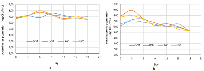 The Azotobacter count increased during 6 days and declined from 6-18 days. However, after 18-days storage the highest population of Azotobacter demonstrated by sterilized compost either compost or vermicompost (Figure 1a). The growth peak of Azotobacter population in compost was recorded at 6-day incubation but highest Azotobacter count in sterilized compost was at day 9. At the end of experiment, population of Azotobacter in both enriched sterilized compost was 1 log higher than before inoculation compared to unsterilized one.