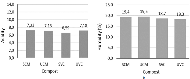 Figure-2. The acidity (a) and humidity (b) of manure compost and vermicompost 18 days after enrichment with Azotobacter liquid inoculant. SCM: sterilized composted manure, USM: unsterilized composted manure; SWC: sterilized vermicompost; UWC: unsterilized vermicompost