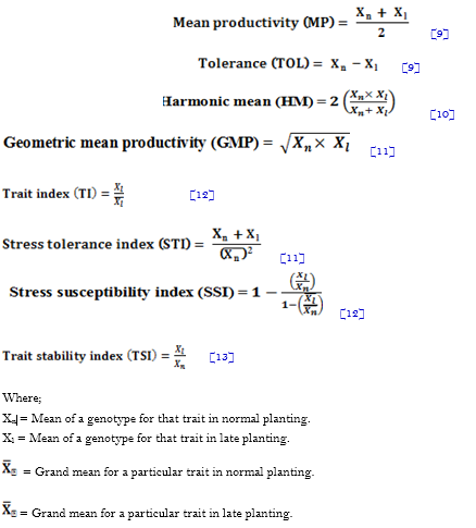 The collected data on days to maturity and grain yield were statistically analyzed according to the procedure suggested by Gomez and Gomez [8] using computer software SAS and SPSS package. Subsequently computing significant differences among the genotypes, environments and genotype × environment interactions, the means were further equated by using least significant difference (LSD) test at 5% level of probability. Beside this, the normal and late planting conditions were assumed as non-stress and stressed conditions to work out the following stress selection indices.