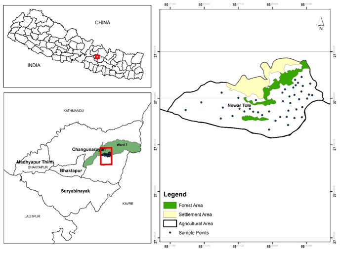 Study area of the research is dominated by ethnic communities (Newar) situated in Changunarayan municipality-07, Bhaktapur district of Nepal. It extends from latitude 27° 41' 24.63"N and longitude 85° 28' 19.08"E to latitude of 27° 41' 26.94"N and longitude of 85° 29' 1.9"E Figure 1. The altitude of site varies between 1362masl to 1505masl. Also, the site predominantly had a loamy textured soil with variation in slope, altitude and aspect.