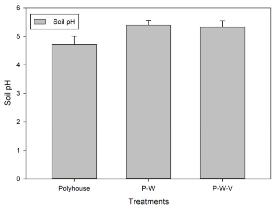 Multiple factors modify the soil pH, for example, the accumulation of organic matter, harvesting high yielding crops, and nitrification of applied nitrogen [22, 23]. Soil acidity greatly impact the soil fertility at soil pH values < 5.5 [23]. Therefore, understanding the pH values of agricultural soil is critical for increasing the crop yield. Results indicate that the soil under polyhouse has significantly (p<0.05) lowest pH (4.78) compared to paddy-wheat-vegetable (5.33) and paddy-wheat (5.37) Figure 2. Soils in the study area were moderately acidic to strongly acidic Table 2. This suggests that the parent material in the study area is acidic. Unlike other studies [24, 25], our findings indicated lower pH resulting from vegetable cultivation under polyhouse. The difference in soil management practice and agricultural inputs inside polyhouse compared to other treatments might have cause the reduction of soil pH. Increased quantity of nitrogen based fertilizer can increase soil acidity inside polyhouse [26]. However, vegetable crops like tomatoes are mostly cultivated inside polyhouse which prefer soils with neutral pH. [27].