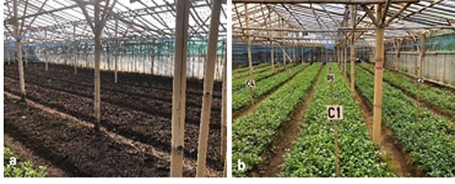 Figure-2. Beds in the field after soil preparation a week before planting (a) and celery grown in pots at 6 weeks after transplanting.