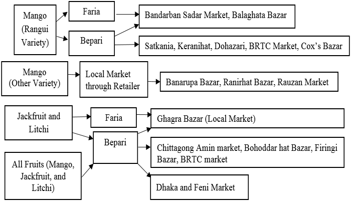 The study attempts to analyze suitable markets, market opportunities, and the estimation of the profitability of the selected seasonal fruits for the market intermediaries in Chittagong hill tracts of Bangladesh. The study was conducted at the CHT region such as; Bandarban and Rangamati district and some parts of the Chattagram region to document the socio-economic profile of the market actors of selected fruits and identify the suitable market opportunities and profitability of those fruits in the market. The chosen samples included 86 market actors. In the study area combined, 90% of Aratdar took formal education among all the market actors. In the case of education, 35% of market actors were found who have the level of education from primary to SSC, and 30% had primary education, 29% intermediaries were found to have finished their SSC level. The frequent and common variety sent to various markets was the Rangui variety of mango as the productions of other types were not more to supply. It was also observed that other fruits like jackfruit and litchi were sold more in the local market than supplying it to the distant market. When estimating growers' share, the study found the dominant channel for mango, jackfruit, and litchi to be the same (farmer- Faria-consumer), 64%, 38%, and 57%, respectively. The efficient marketing channel for mango (2.17) was (farmer-Bepari-Aratdar-retailer-consumer). For jackfruit, (farmer-Bepari-Aratdar-consumer) was found to have an efficient channel (1.27), and for litchi, (farmer-Faria-consumer) had the highest marketing efficiency (2.00).