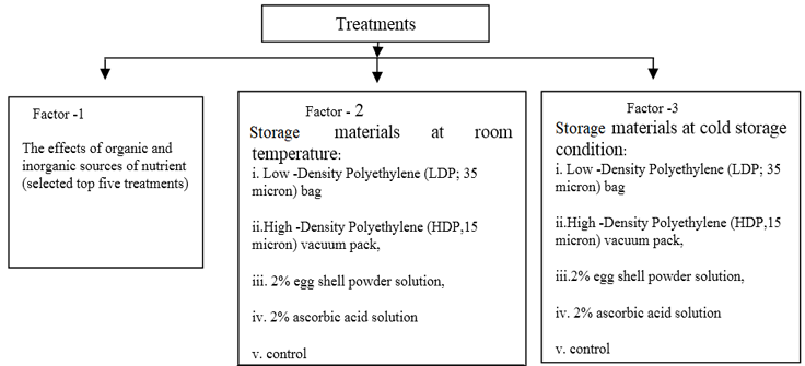 Preservation capability of broccoli is comparatively poor than other Cole crops like cauliflower. Yellowing is the main problem in post-harvest life of broccoli which leads to poor marketability due to consumer dislike [10]. Farmers are not aware about the shelf life of broccoli. They apply huge amount of chemical fertilizers and pesticides often overdoses, more frequencies and even mixing of two or more chemicals as cocktail formulation to achieve better yield during production [11]. Consequently, the storage longevity of broccoli reduces spontaneously. In this circumstance, it is essential to improve post- harvest quality and lingering the shelf life of the said crop. The investigator opined that application of appropriate organic manures viz. Vermicompost, Tricho-compost and Farm Yard Manure (FYM) in combination with chemical fertilizers is one of the best options to maintain the shelf life of broccoli. Packaging materials help not only to keep these vegetables from drying out but also to preserve nutritive value, flavour, texture and color [12]. Polyethylene bag delayed color change due to synchronized effect of increased humidity and fluctuated atmosphere composition [13]. Vacuum pack with low temperature (storage at 40 C with 95% RH) is the effective technique to maintain the shelf life of broccoli [14]. Hence, this study also focuses on low cost technology like, Low- Density Polyethylene (LDP; 35 micron) bag, High -Density Polyethylene (HDP; 15 micron) vacuum pack, 2% egg shell powder and 2% ascorbic acid solution to sustain the shelf life of broccoli both at room temperature and cold storage condition. Very few investigators studied partially on the above context. Considering above all, the investigator would like to take an in -depth study on "The effects of Organic and Inorganic Sources of Nutrient on Yield, Quality and Shelf life of Broccoli".