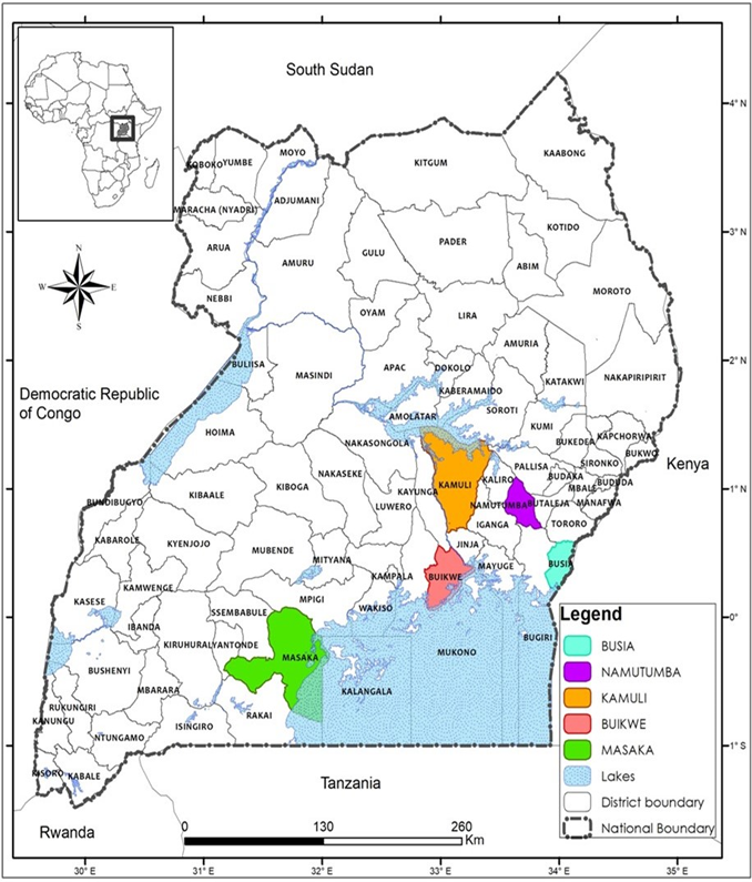 The study was carried out in LVB districts of Uganda covering Buikwe, Busia, Kamuli, Masaka and Namutumba districts Figure 1. Uganda (1° 00' N and 32° 00' E); is one of the LVB landlocked country lying astride the equator. It lies on the north-western shores of Lake Victoria, extending from 1° South to 4° North latitude and 30° to 35° East longitude. Uganda is bordered by Tanzania and Rwanda to the South, Democratic Republic of Congo (DRC) to the West, South Sudan to the North, and Kenya to the East.