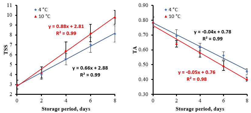 The zero-order kinetic model that defined the experimental results of  TA when strawberry stored at 4°C and 10°C was evaluated using R2= 0.9915 and 0.9825, respectively (Table 2). In storage at 10 °C and 4 °C, the TA of strawberry fruit had a low kinetic rate constant (k), with values ranging from -0.08 to -0.0399 day-1, respectively.