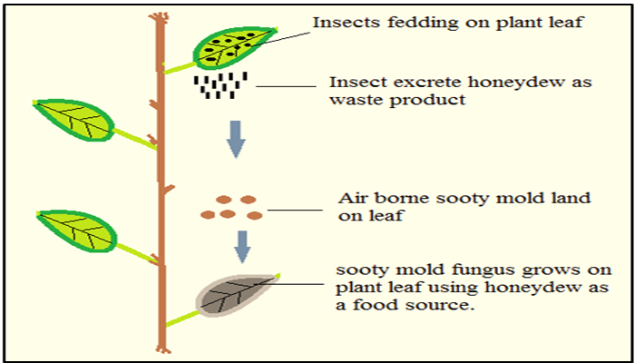 Leaves and fruit showed that the dark, felty growth from sooty mold was covering large areas of all surfaces. They can be scraped off of plant surfaces (Fig. 1). Infested plantations lose leaves and decreased their annual growth, leaf lamina became dry and brown Excretes honeydew as waste product after sucking thesap of plant leaf, which fell on underneathplant leaves and became a well medium of sootymold fungus. As a result plant leaves becamecompletely black due to sooty mold reduced leafphotosynthesis and gas exchange and became unfit.