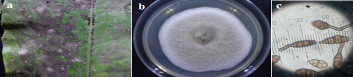 Figure-3.a. Fungus grows on upper surface, b: Colony of A. alternata, c: conidia (40x).