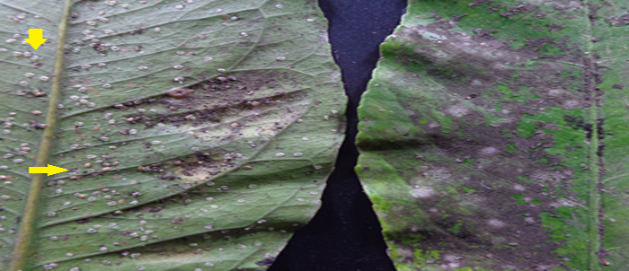 Infested plants were stunted and leaves turn yellow and may drop off. Whiteflies secrete honeydew on which sooty mold may develop [28]. Several studies reported that the sooty mold can grew on leaf surface of plant [10, 24, 25, 29].