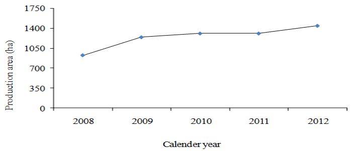The floriculture industry especially that of the rose production has been experienced unique and unexpected high speed in its development in the last decade in Ethiopia. The area under rose production in 2004 for instance was only about 40 ha which increased to 250 ha in 2006. The area further increased from 922 ha in 2008 to over 1440 ha in 2012 (Figure 1) and it is positioned to grow even more [4]. Similarly, the number of cut flower stems exported to various countries raised from 83 million in 2005 to 2,102 million stems in 2012