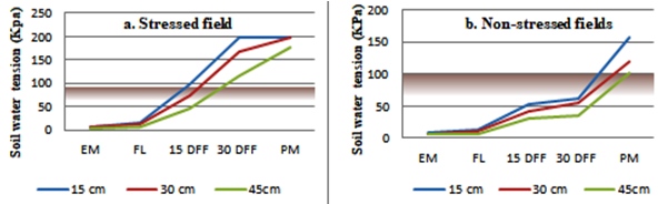 The increasing awareness on its productive capability and food value placed potato (Solanum tuberosum L.) among the most important staple food crops in the world. In recent years, its production has been increased substantially throughout Ethiopia from mid to high altitude areas and in lowlands to some extent both under rain-fed and irrigated conditions. The average productivity of potato at farmers’ field is very low i.e 12.3 tha-1 [1] which is only about one-fourth of achievable yields (34-47 tha-1) at research stations. Diverse and complex biotic, abiotic, and anthropogenic factors have contributed to the gap between the attainable potential yield and the existing low productivity of potato in Ethiopia. Among the abiotic stresses, drought is the most complex and serious danger to global agricultural production [2]. Potatoes regularly undergo through a short-lived water shortage in most of the rain-fed growing regions due to erratic rainfall or inadequate supplemental irrigation techniques [3]. Cut-off rain late in the growing season is the major cause for potatoes to suffer from drought in in the major production ecologies in Ethiopia [4]. Moreover, drought resistance is amongst the priority attribute growers make choice for cultivars to plant with. This problem can be mitigated by breeding varieties which can produce stable yields in water limiting conditions. However, different crops respond differently to water stress with respect to various morphological, physiological and yield related traits. Hence, identification of easily measurable drought adaptive traits with good degree of heritability and higher degree of association with improved yield under drought is critical for developing successful breeding program. Some leaf-water relation traits of plants have been advocated as indicators for the development of drought resistant genotypes i.e. relative water content of leaf [5] and excised leaf water loss [6]. However, similar works on potato was minimal. Moreover, in the face of climate change and population growth, it needs to develop drought adaptive potato cultivars. Accurately identifying drought resistance traits and understanding the interaction amongst these traits with tuber yield are pertinent inquiries to be addressed. Therefore, this particular study was carried to evaluate the response of potato genotypes for post flowering drought stress and identify leaf-water relation traits en route for identifying drought resistant genotypes.