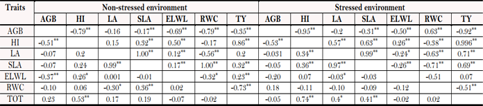 CV: Coefficient of variation; AGB: above ground biomass, HI: harvest index, LA: leaf area, SLA, Specific leaf area, ELWL: excised leaf water loss, RWC: relative water content of the leaf; TOT: total tuber yield; * and ** represent significant differences at the 0.05 and 0.01 levels, respectively.