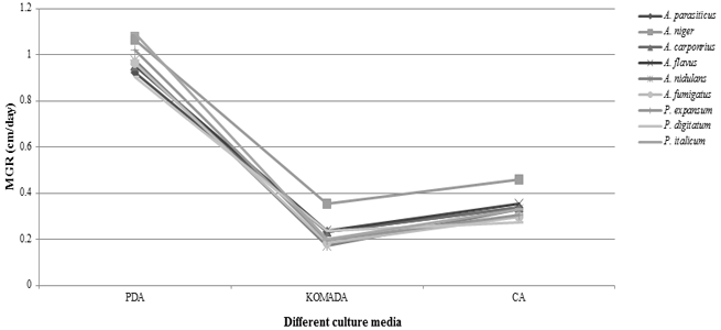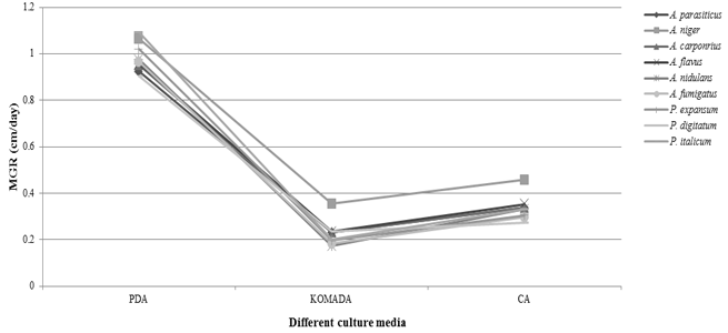 Figure-1. Effect of culture media (Potato dextrose agar (PDA), Komada medium, Carrot Agar (CA)) on the mycelial growth rate (MGR) of Aspergillus and Penicillium species. Regression equation, coefficient of determination (R2) and optimal culture media (OCM) for mycelial growth of Aspergillus and Penicillium species. y = adjusted with the values of the MGR at three culture media. OCM = optimal culture media for mycelial growth of Aspergillus and Penicillium species calculated from the regression equation: A. parasiticus (y = 0.3979x2 - 1.885x + 2.4121; R2 = 0.99); A. niger (y = 0.4054x2 - 1.9236x + 2.582; R2 = 0.99); A. carponrius (y = 0.4138x2 - 1.9619x + 2.5016; R2 = 0.99); A. flavus (y = 0.4194x2 - 1.9799x + 2.5184; R2 = 0.99); A. nidulans (y = 0.4793x2 - 2.2398x + 2.7368; R2 = 0.99); A. fumigatus (y = 0.4471x2 - 2.123x + 2.642; R2 = 0.99); P. expansum (y = 0.4663x2 - 2.2232x + 2.7785; R2 = 0.99); P. digitatum (y = 0.3519x2 - 1.7224x + 2.2742; R2 = 0.99); P. italicum (y = 0.5104x2 - 2.423x + 3.0064; R2 = 0.99).