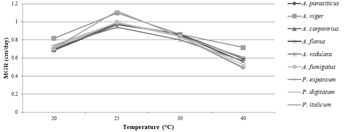 Figure-3. Effect of temperature (20, 25, 30 and 40) on the mycelial growth rate (MGR) of Aspergillus and Penicillium species. Regression equation, coefficient of determination (R2) and optimal temperature (OT) for mycelial growth of Aspergillus and Penicillium species. y = adjusted with the values of the MGR at different temperature. OT = optimal culture media for mycelial growth of Aspergillus and Penicillium species calculated from the regression equation: A. parasiticus (y = - 0.138x2 + 0.6529x + 0.1823; R2 = 0.968); A. niger (y = - 0.1067x2 + 0.4795x + 0.4763; R2 = 0.762); A. carponrius (y = - 0.1394x2 + 0.6545x + 0.1929; R2 = 0.954); A. flavus (y = - 0.1462x2 + 0.6767x + 0.181; R2 = 0.965); A. nidulans (y = - 0.1112x2 + 0.4945x + 0.3574; R2 = 0.950); A. fumigatus (y = - 0.1588x2 + 0.7167x + 0.1616; R2 = 0.978); P. expansum (y = - 0.1494x2 + 0.658x + 0.2401; R2 = 0.983); P. digitatum (y = - 0.1449x2 + 0.6488x + 0.2369; R2 = 0.967); P. italicum (y = - 0.1579x2 + 0.7319x + 0.1746; R2 = 0.809).