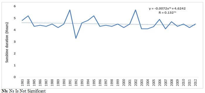 Figure 5 shows that there has been reduction in sunshine duration between 1983 and 2012. However, the trend is not significant as well as the correlation (0.132). This finding corroborates with that of Onyeneke and Madukwe (2010); Nwajiuba and Onyeneke (2010) who observed that duration in rainforest zone of Nigeria is recording insignificant trend.