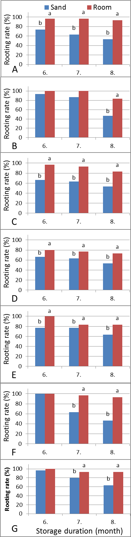 Figure-2. Changes in rooting rate (%) as influenced by storage conditions (A: Ekşi Kara, B: Sultani Çekirdeksiz, C: Narince, D: Alphonse Lavallée, E: Büzgülü, F: Göküzüm, G: Siyah Dimrit).