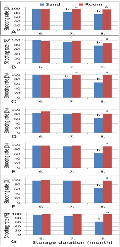 Figure-3. Changes in shooting rate (%) as influenced by storage conditions (A: Ekşi Kara, B: Sultani Çekirdeksiz, C: Narince, D: Alphonse Lavallée, E: Büzgülü, F: Göküzüm, G: Siyah Dimrit).