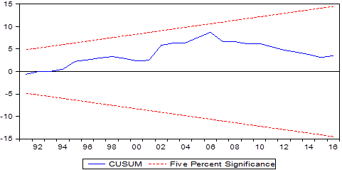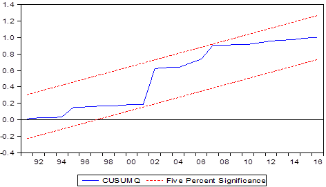An array of diagnostic tests was carried out on the multiple linear regression model in line with the requirements of the Classical Linear Regression Model (CLRM). These tests included Augmented Dickey-Fuller Test, White’s Hetereoskedasticity Test, Ramsey Regression Error Specification Test (RESET), the CUSUMQ, Breusch Godfrey Serial Correlation Tests, Durbin Watson Test and CUSUM Test. The data were analyzed using the ARDL technique. The significance level was 0.05%.