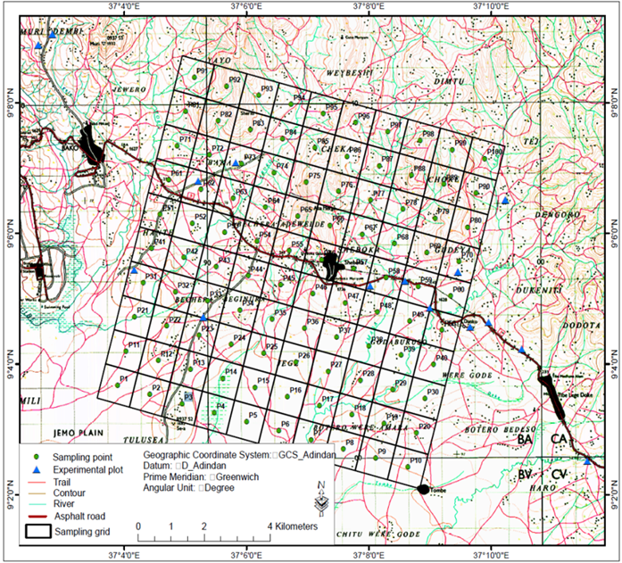 Before conducting the survey, training was given to staff members from Ambo Agricultural Research Center, under the Ethiopian Institute of Agricultural Research (EIAR). The maize farm was surveyed at three different crop stages (vegetative stage, flowering stage, and harvesting stage). Data during each crop stage was collected using open data kits (ODK). For the two crop stages (vegetative and flowering stages) data was collected from farms of 100 households. However, during the harvesting stage crop data was collected only from farms of 73 households since some farmers have already harvested due to the untimely rain. All crop data was recorded and soil sampling was made from 4 m x 4 m quadrants from randomly selected three quadrants per farmer’s field.