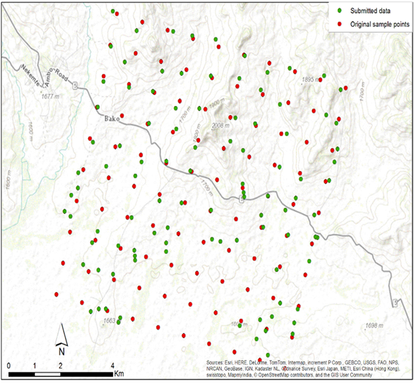 Source: The MAP was developed by GIS guys using coordinates of the study sites. NB: Red dots are central points of 1 km by 1km sub-grids, while green dots are actual sampling points.